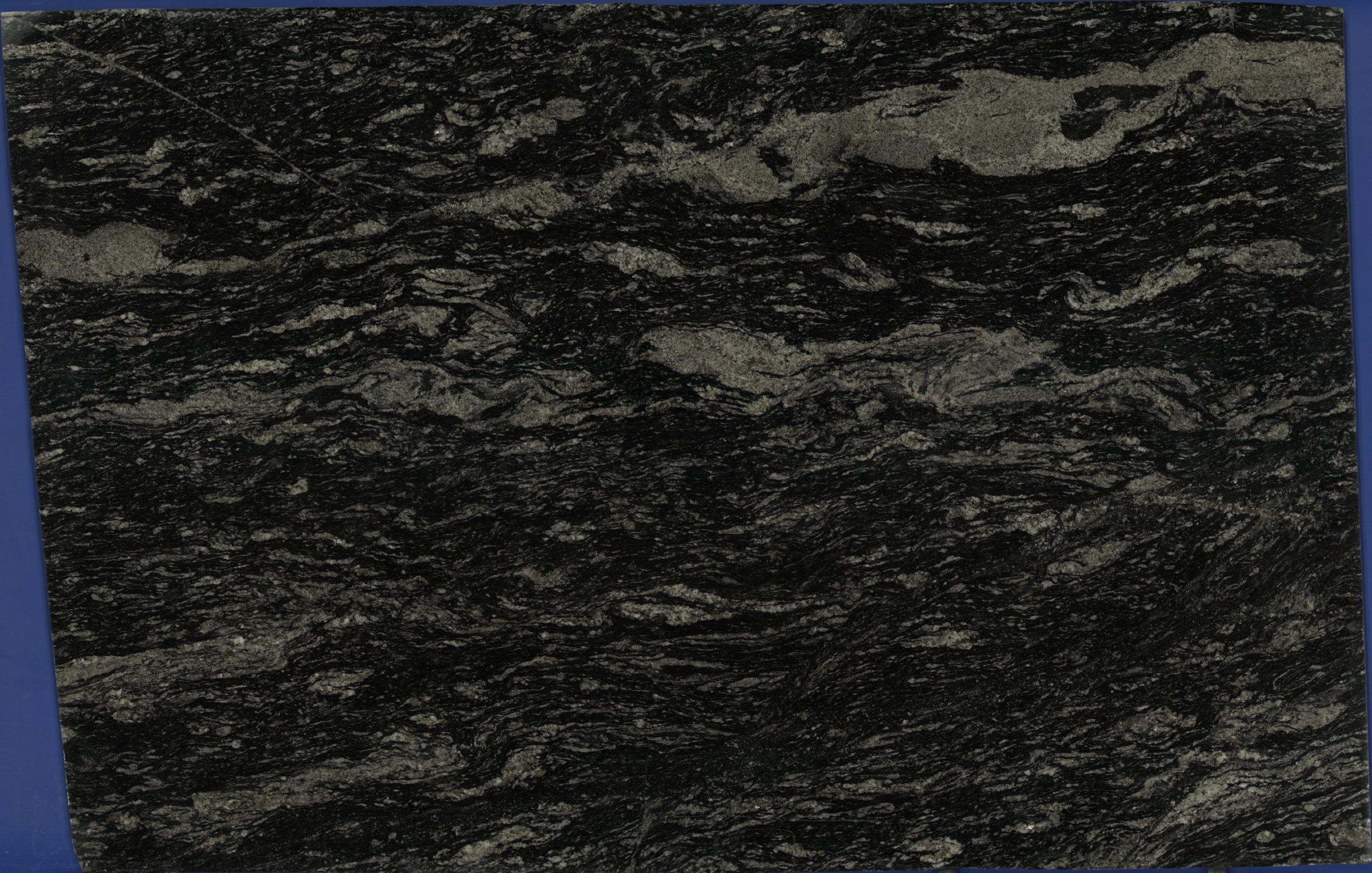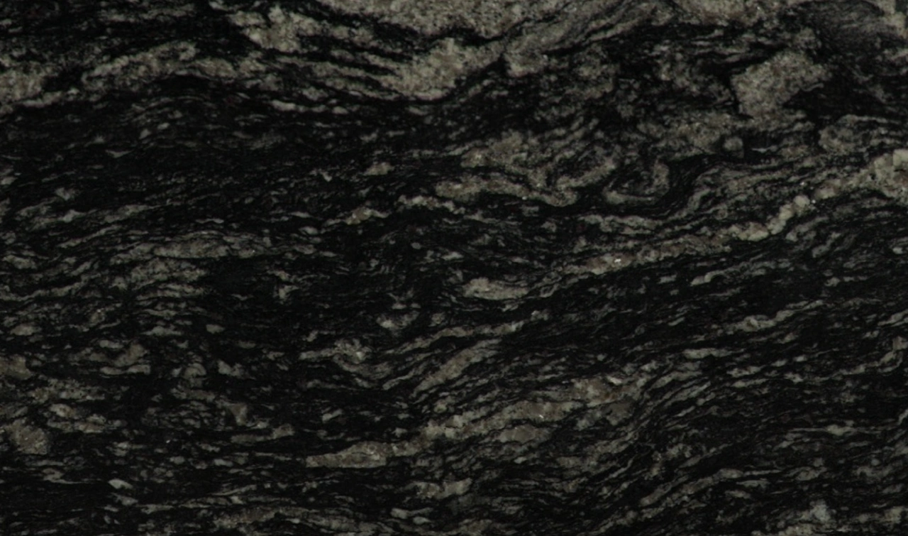 Black Forest granite is a dramatic natural stone characterized by its deep black base, interwoven with striking, swirling veins of silvery-gray and hints of pale gold. Its surface features a bold, flowing pattern that resembles the intricate layers of a forest canopy, enhanced by the polished finish that brings out a glossy sheen and subtle sparkle. The rich contrast between the dark background and lighter veins creates a luxurious, dynamic look, with light reflecting off the stone to highlight its textured depth.