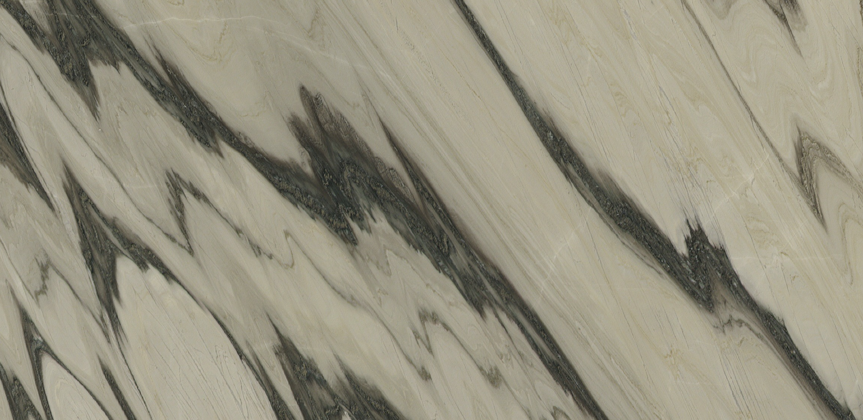Calacatta Ludovico features a pristine white base, adorned with striking, bold gray and gold veining that sweeps across the surface with sharp, flowing patterns. The veining, ranging from wide, dramatic strokes to finer, intricate lines, creates a luxurious, marble-like texture with subtle crystalline flecks that shimmer under light. Hints of warm ivory undertones and occasional speckles add depth, while the polished finish enhances its radiant, glossy sheen.