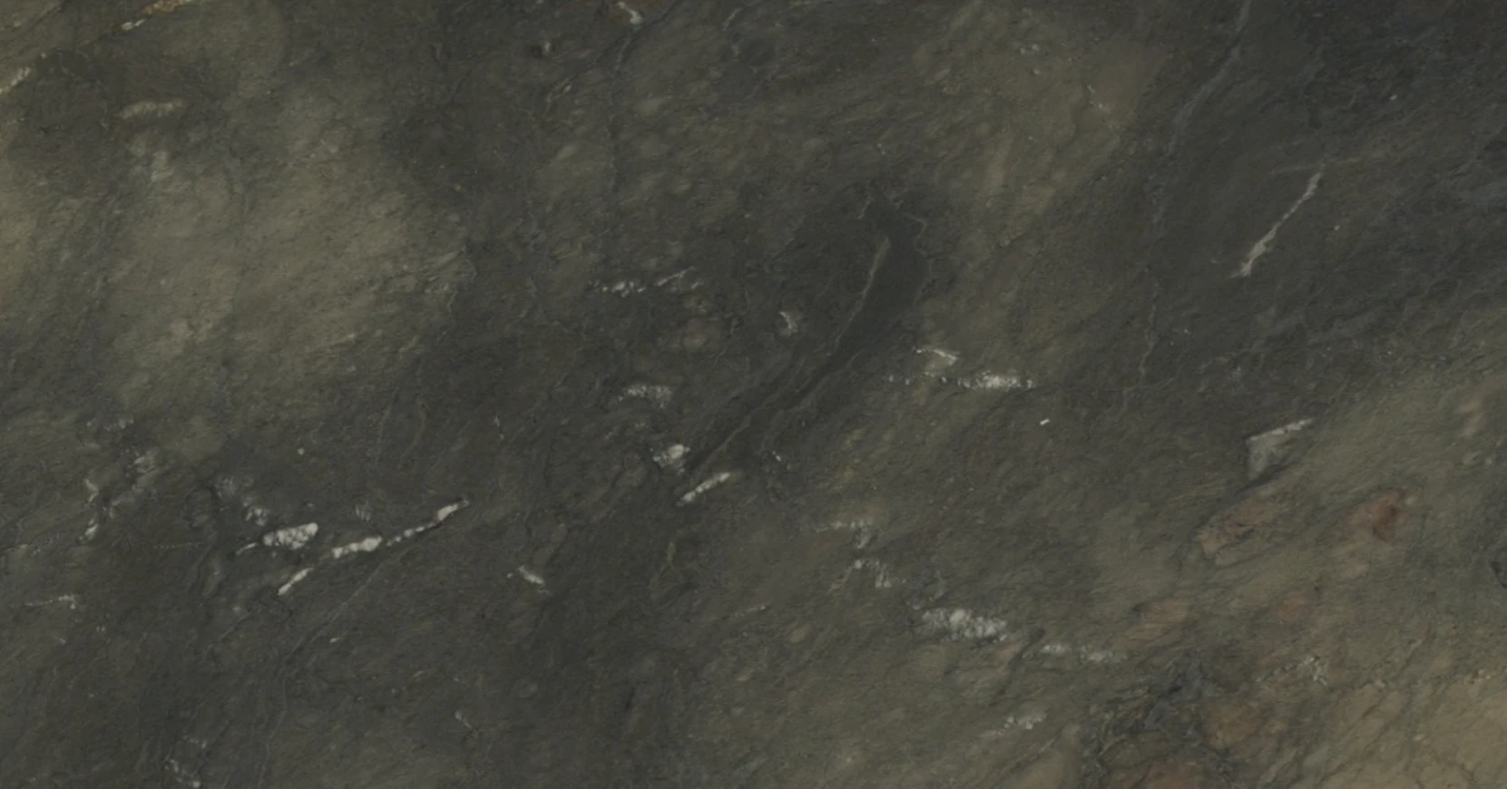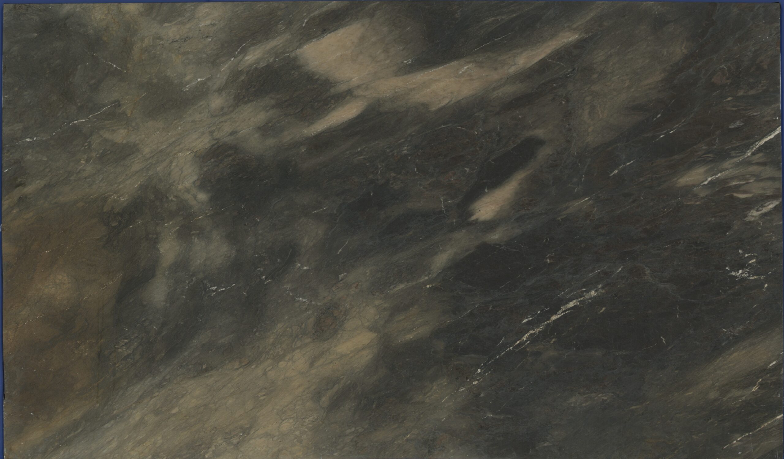 Sienna Gold quartzite features a rich, moody palette dominated by deep charcoal and smoky gray tones with warm golden-brown undertones flowing throughout. The stone displays dramatic diagonal veining and sweeping patterns that create a sense of fluid movement across the surface. Soft beige and bronze highlights emerge against the dark base, adding depth and luminosity to the composition. Delicate white veining provides subtle contrast, while the overall effect suggests layers of earth and shadow. This sophisticated quartzite offers striking visual drama with its blend of dark, earthy tones and warm metallic accents, perfect for creating luxurious, contemporary spaces.